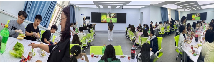 接下来,许晓慧、祁淑红与吴迪三位老师创新性地以制作美式汉堡为教学载体,将西方饮食文化体验与能力培养目标深度融合,开展了一次跨文化实践之旅。当同学们围坐在操作台前做汉堡时,芝士的香气与面包的焦香营造出轻松开放的交流氛围,同时老师们用风趣的语言进行了讲解:生菜象征美国人对健康饮食的追求,而酱料调配则体现了文化融合——就像你们未来要面对多元的学术环境一样。这种将抽象文化概念具象化为可操作步骤的教学方式,让同学们直观感受到跨文化交际的实质。