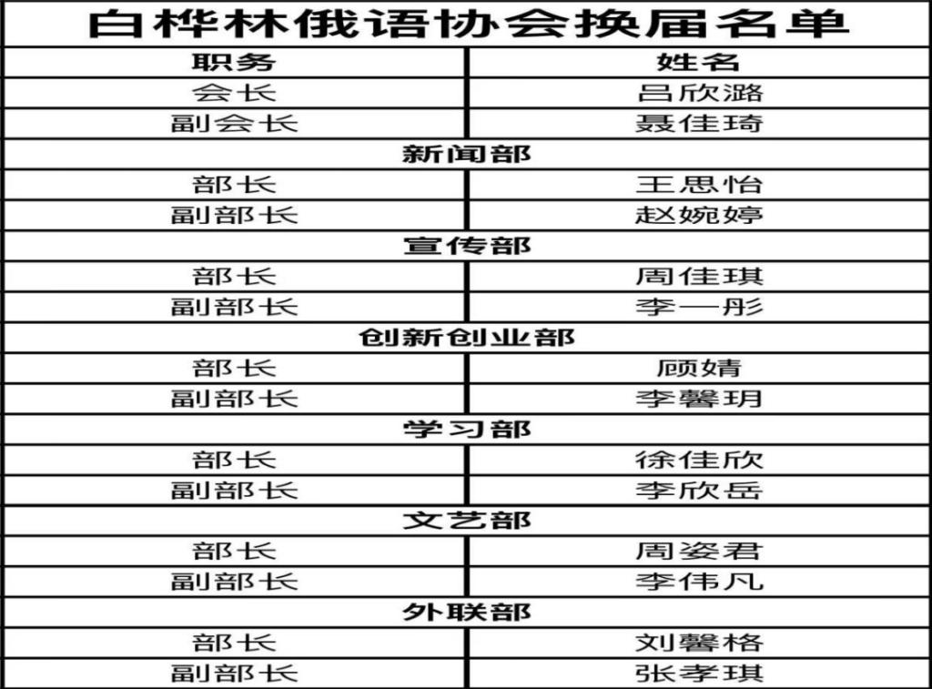 此次换届大会的顺利召开,不仅是一次职责的交接,更是一次精神的传承与团队的凝聚,更进一步强化了全体成员的归属感与向心力。展望未来,白桦林俄语协会将继续以“文化为纽带、语言为桥梁”,持续搭建多元化俄语学习平台,助力同学们提升俄语综合素养,为校园外语文化建设贡献更多力量,共创协会新的辉煌!