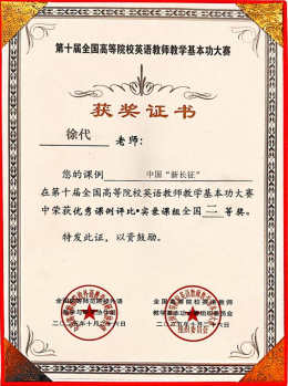 近日,第十届全国高校英语教师基本功大赛实录课现场总决赛在南京理工大学成功举办,英国上市公司官网365商务英语系教师徐代凭借一堂深度融合中国“新长征”精神理论信仰的教学课程,荣获全国二等奖。