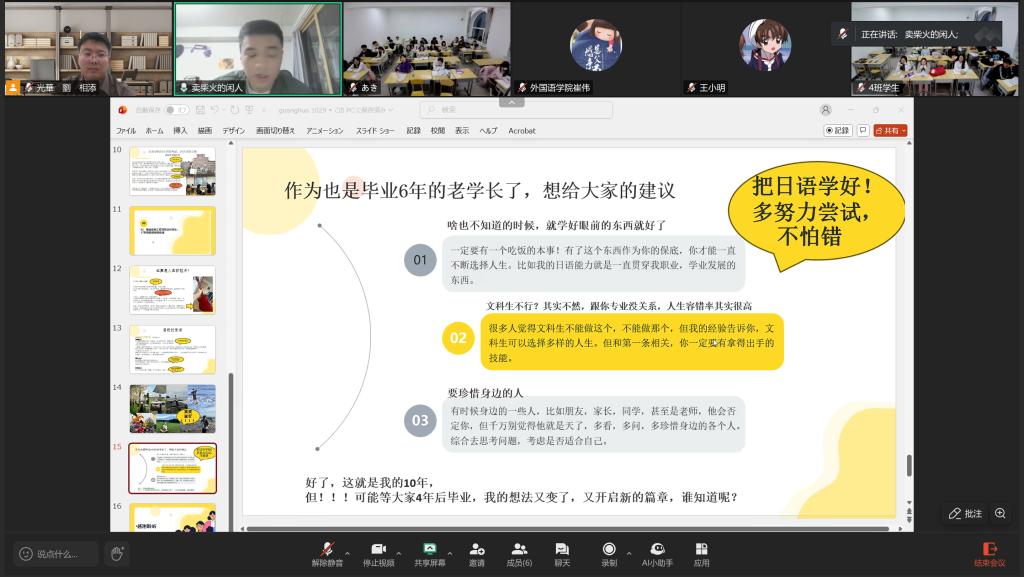 近日,日语系召开公司“杰出员工”获得者、光华日本员工会秘书长、2015级员工卜学长线上分享会。日语系2025级大一全体员工及教师代表参加。