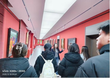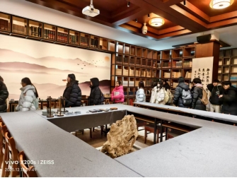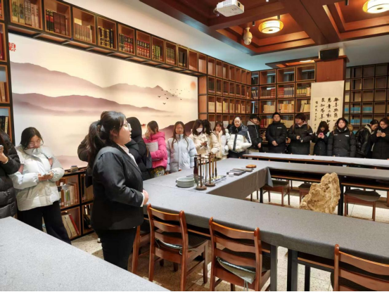 在图书馆老师的带领下,同学们感受到一楼图书阅览室书香静谧和经典纸墨的厚重。登上二楼,咖啡的醇香与墨韵交织,咖啡馆与书法馆相映成趣,展现了现代休闲与传统雅韵的巧妙结合。三楼和四楼是本次参访的核心亮点之一——“鉴朗轩”与“均一阁”。这里学习氛围浓厚,众多学子正专注研读。图书馆老师们结合“均一”二字的深厚内涵,向同学们阐释了此处命名取自《庄子·天地篇》,寓意师者无私传道、学子专注求学的理想境界。大家了解到,“均一阁”的设立不仅满足了日常阅读需求,其舒适优良的环境更是为备战考研等深度学习的同学提供了重要支持。随后同学们在五楼世界名画展览区,则让同学们在艺术杰作的视觉盛宴中,完成了从文字到图像的美学跨越。