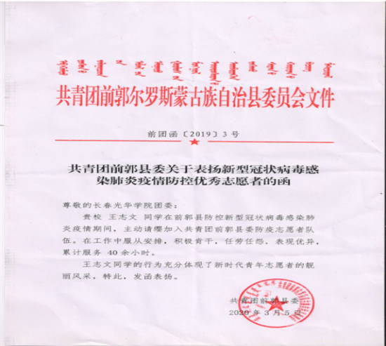 2020年1月28日我加入了松原团市委防控疫情志愿者工作群,经过网上的志愿者培训与学习,我开始在前郭尔罗斯社区上岗工作,主要进行社区人口普查、信息统计、测温等工作。我会更加严谨、细致、认真的坚守自己的岗位,尽自己所能助力于这场防控疫情阻击战的胜利。让我们万众一心,众志成城,坚决打赢疫情防控阻击战。